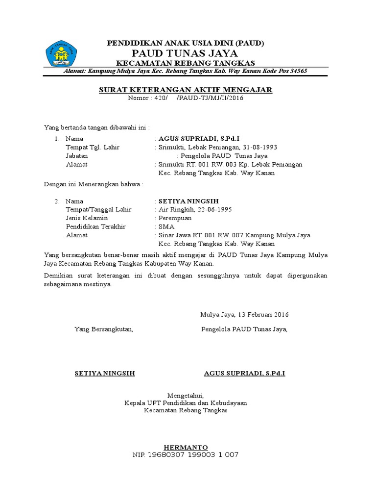 Surat Keterangan Aktif Mengajar Mengajar Paud Tunas Jaya