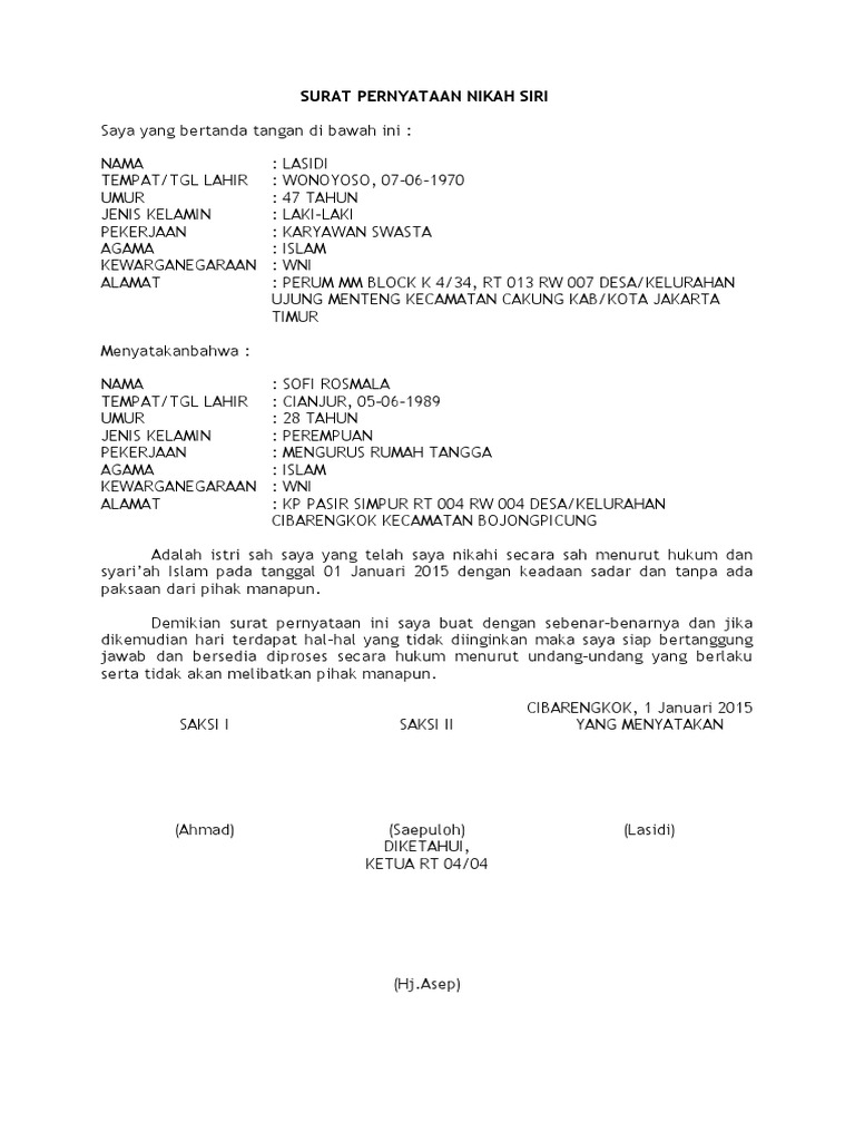 Contoh Surat Pernyataan Nikah Siri Contoh Surat