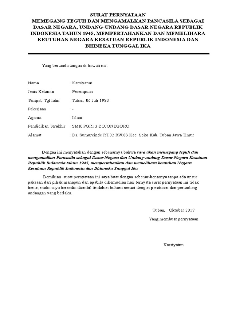 Kumpulan lengkap Contoh Surat Pernyataan Memegang Teguh Dan Mengamalkan Pancasila Uud 45.