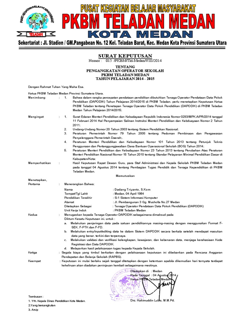 Contoh Sk Operator Sekolah Sd Smp Dan Sma Dokumen Sekolah