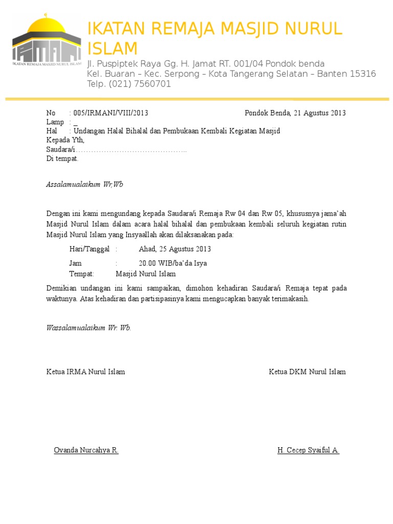 Contoh surat undangan halal bihalal resmi. Contoh surat undangan halal bi halal tak terasa puasa ramadhan tinggal beberapa hari lagi umat muslim setalah usai menjalankan ibadah puasa di bulan ramadhan akan merayakan hari raya idul fitri. Dan lingkungan maka kami pengurus rt 06 rw 02 mengharap kehadiaran bapakibusaudara semua warga rt 06 rw 02 pada. 2009 30 surat undangan halal bi halal warga rt download at 4shared.