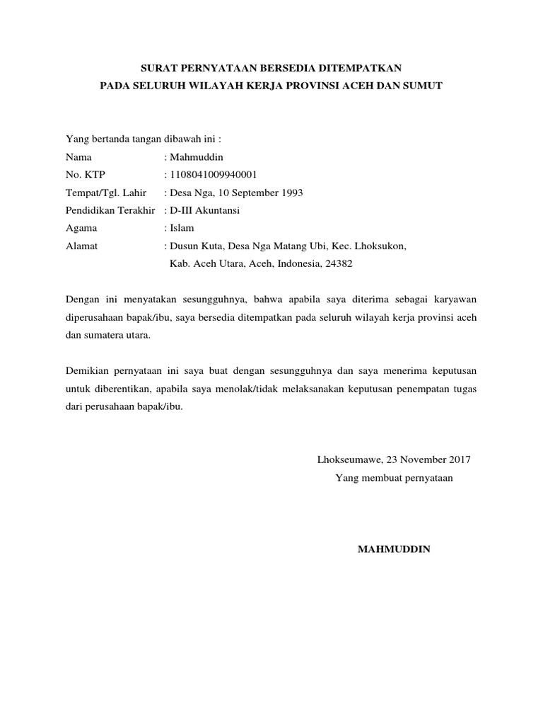 Jika ada sedang mencari Surat Pernyataan Bersedia Ditempatkan Di Seluruh Wilayah Perusahaan.