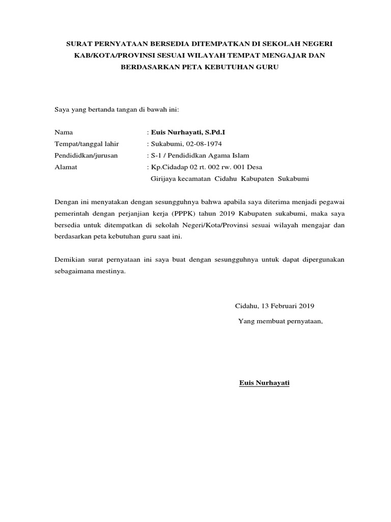 Pppk Surat Pernyataan Bersedia Ditempatkan Di Sekolah Negeri File
