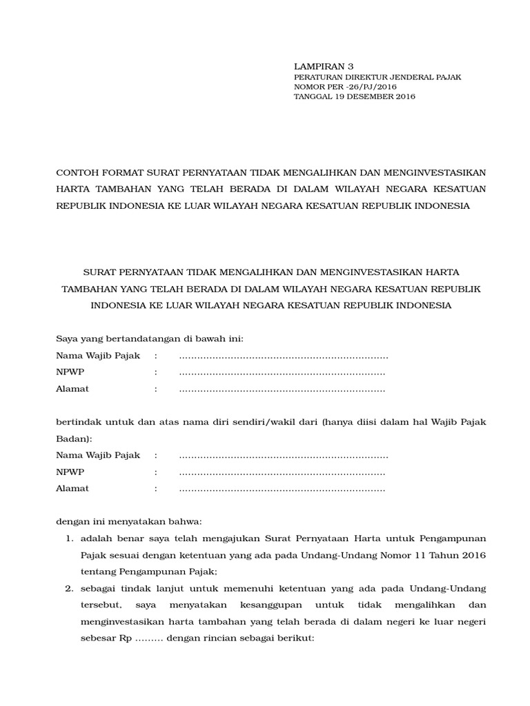 Surat Pernyataan Mengalihkan Dan Menginvestasikan Harta Tambahan