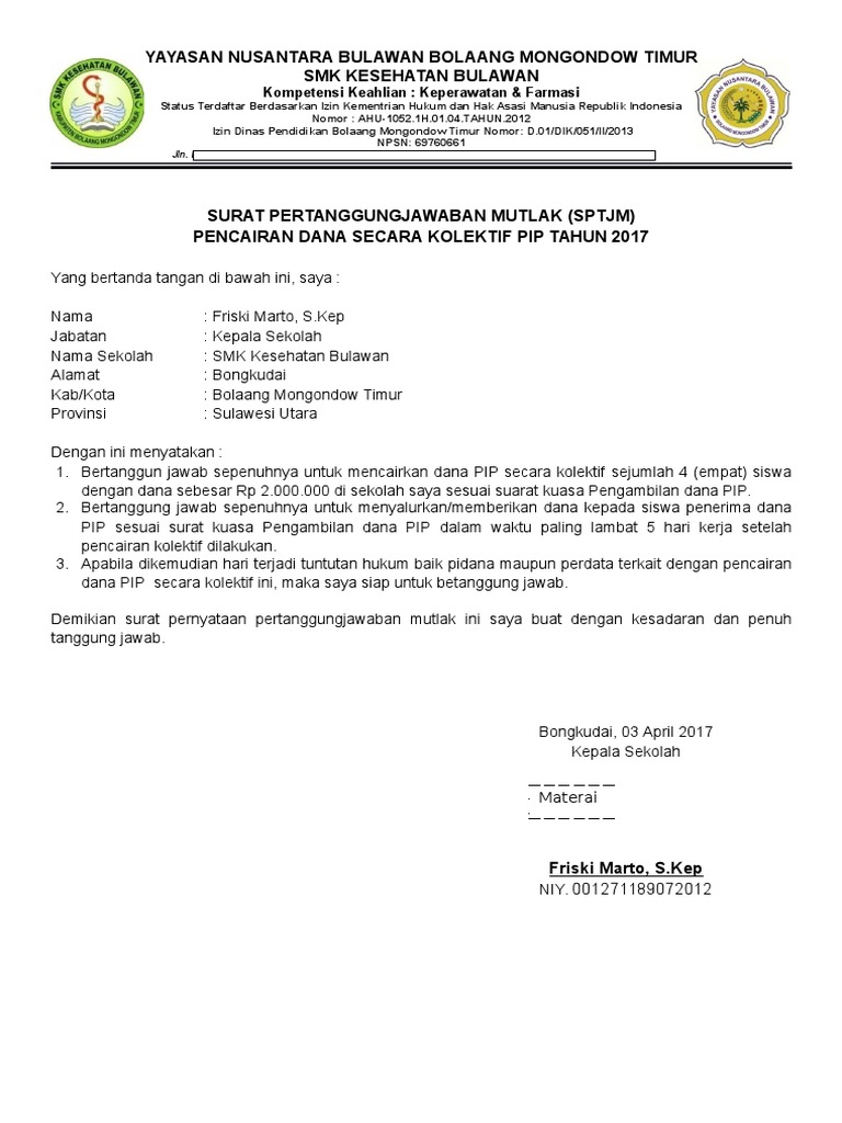 Contoh Surat Pertanggung Jawaban Mutlak Sptjm Bsmpip Ngintip