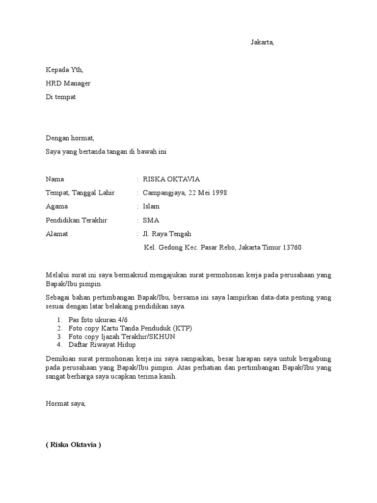 Contoh Surat Lamaran Pekerjaan Dalam Bahasa Inggris Beserta