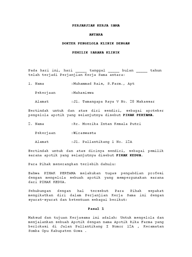 Format Perjanjian Antara Managemen Klinik Dan Apoteker Docx Document