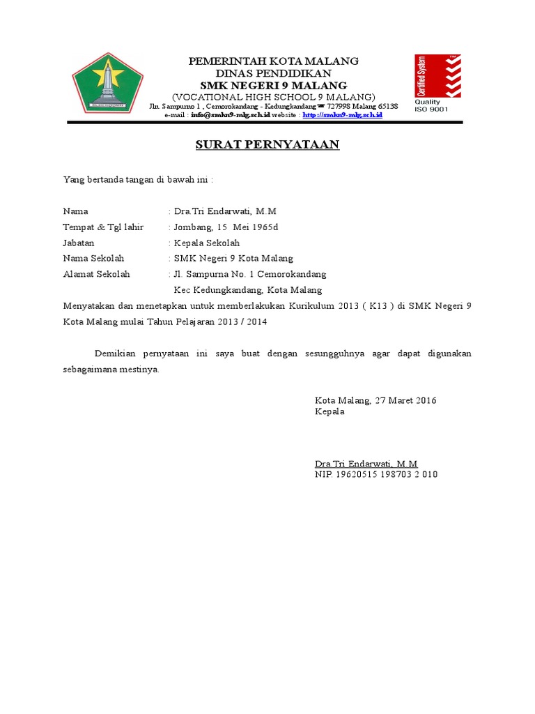Surat Pernyataan Kepala Sekolah Untuk Akreditasi 2019 Di Sispena
