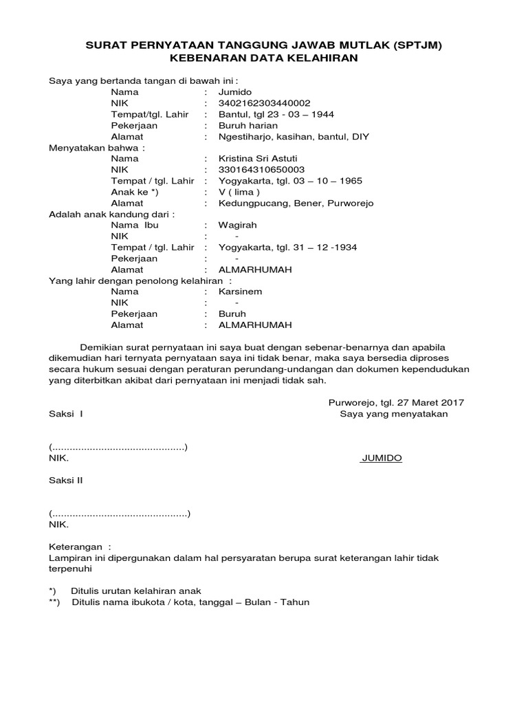 Contoh Surat Pernyataan Tanggung Jawab Mutlak Kebenaran Data Kelahiran