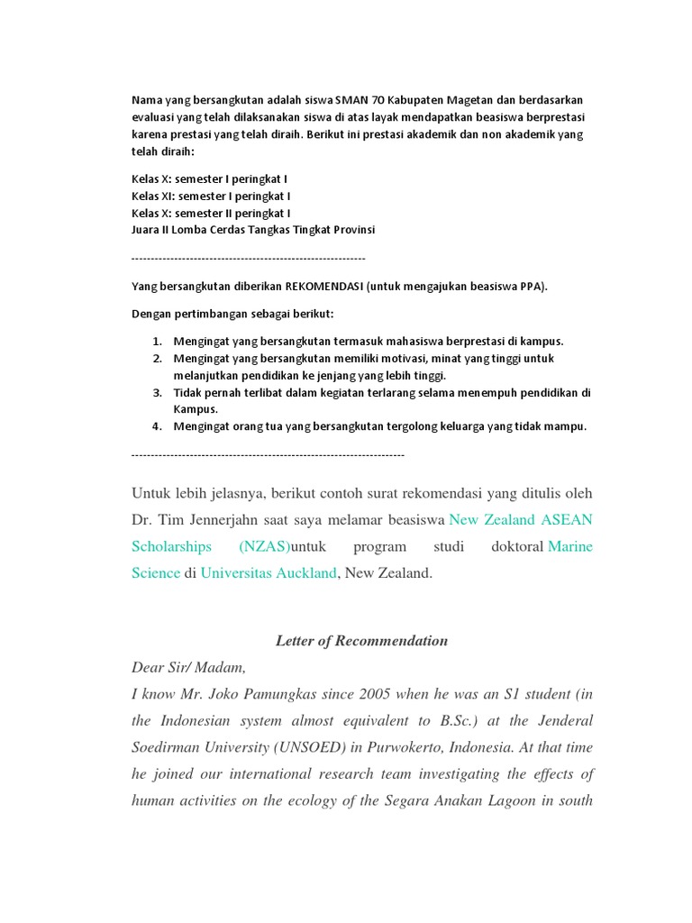 Inilah rekomendasi tentang Contoh Surat Rekomendasi Beasiswa Bahasa Indonesia.