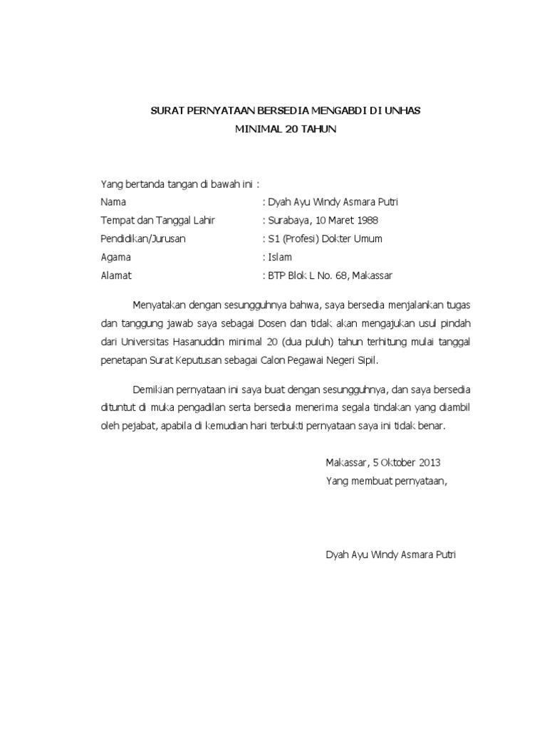 Dengan hormat saya yang bertanda tangan di bawah ini. Dalam hal ini bertindak untuk dan atas nama sendiri menyatakan bersedia.