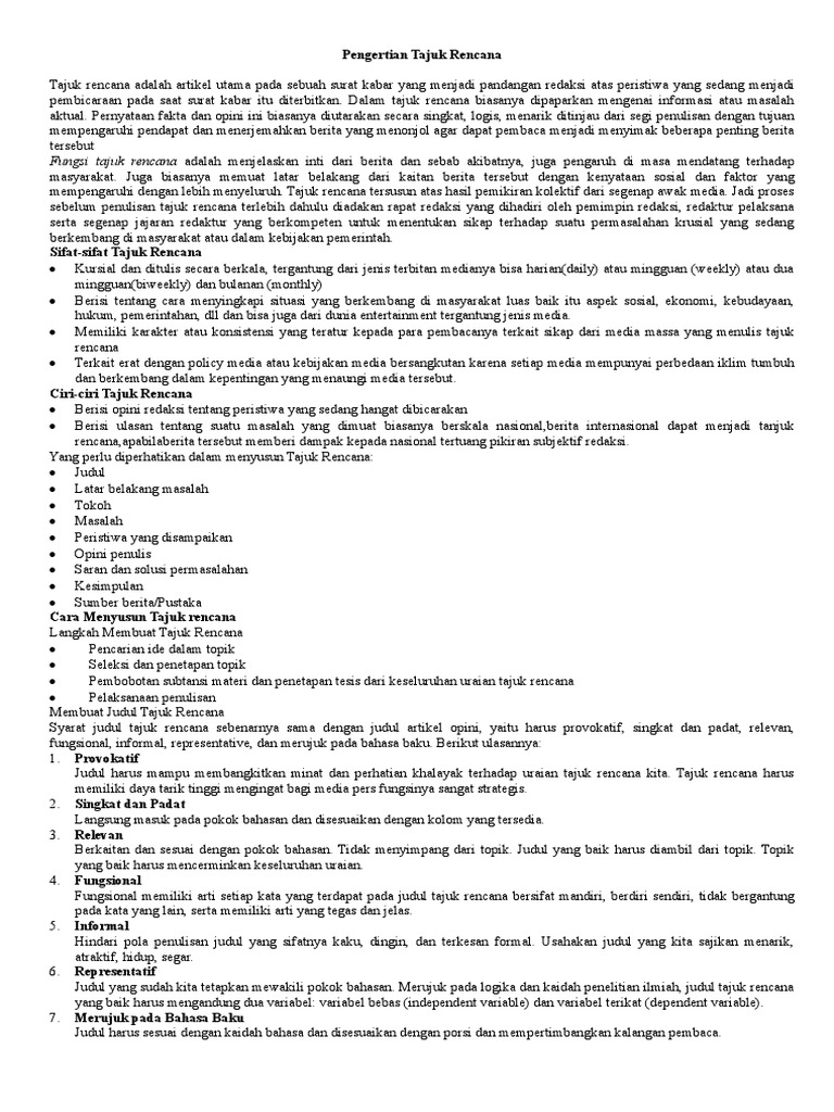 Tajuk Rencana Pengertian Contoh Struktur Fungsi Tujuan Ciri