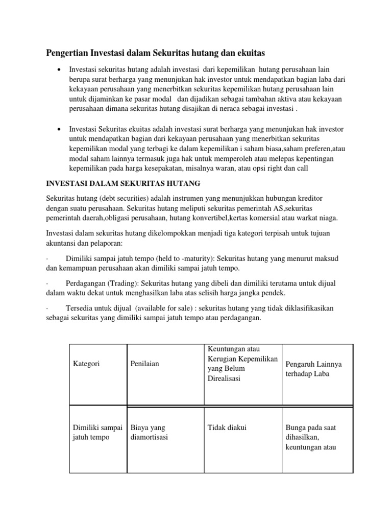 Pengertian Investasi Dalam Sekuritas Hutang Dan Ekuitas