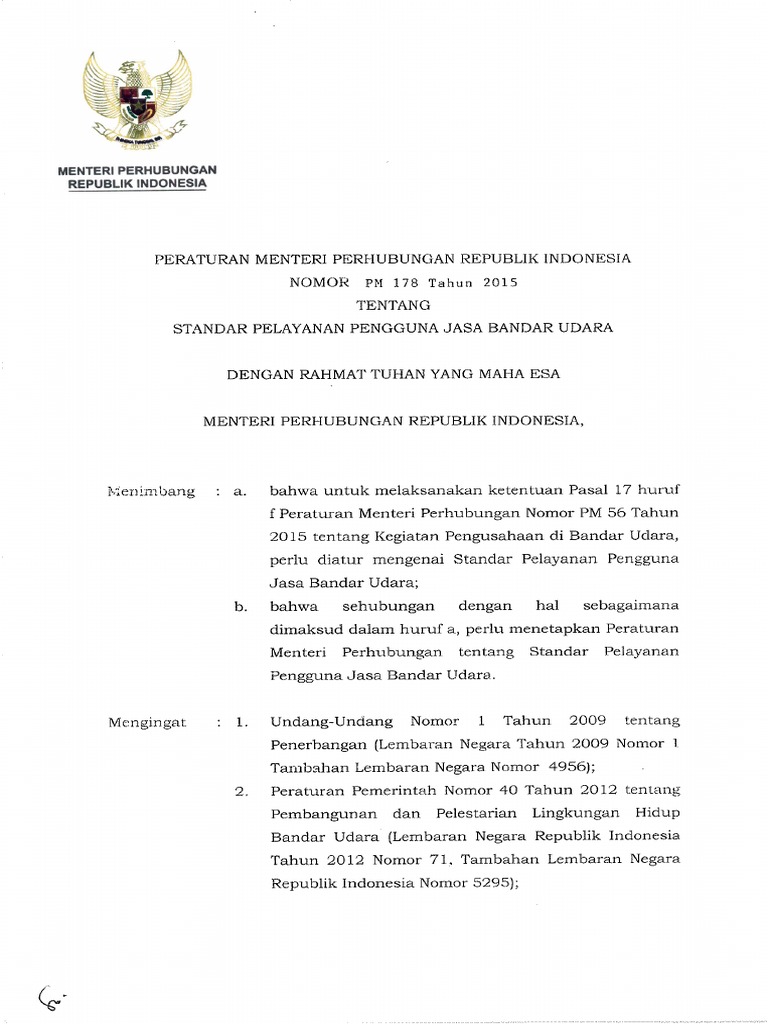 Pm 178 Tahun 2015 Tentang Standar Pelayanan Pengguna Jasa Bandar Udara