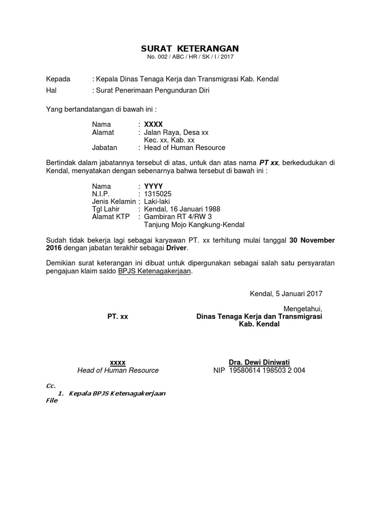Berikut adalah detail Surat Keterangan Pengunduran Diri Untuk Klaim Bpjs.