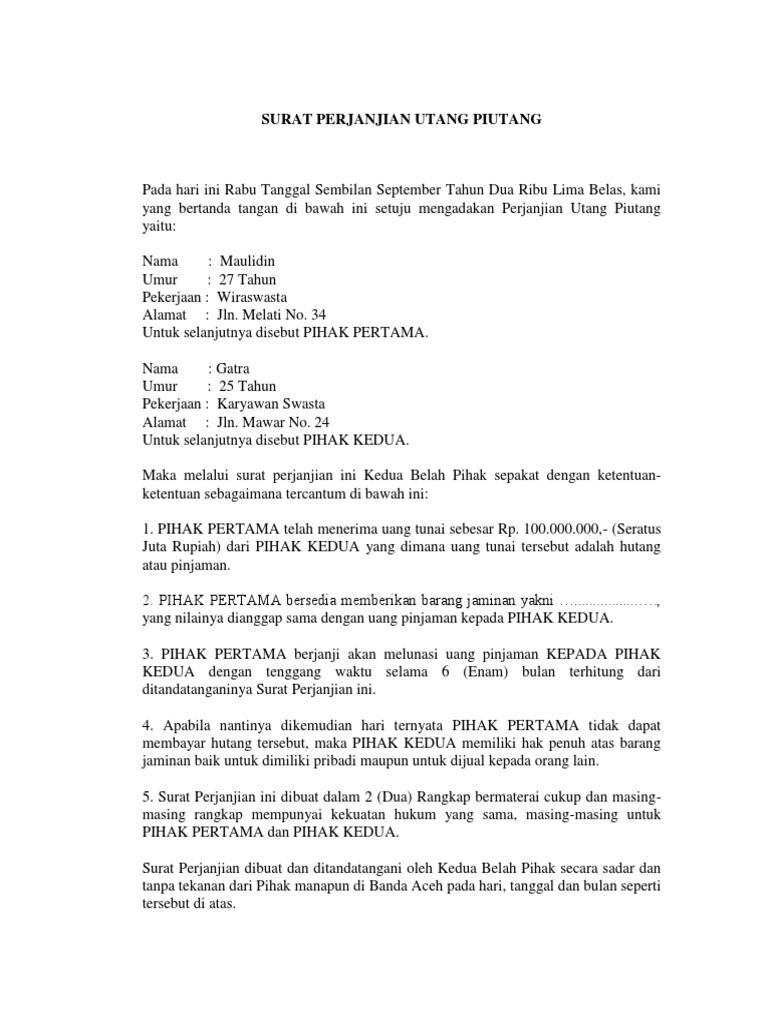 Surat perjanjian hutang piutang tanpa jaminan. Kami akan sangat senang jika anda mau memberikan semoga membantu. Demikianlah contoh surat hutang piutang baik dengan atau tanpa jaminan. Membuat surat perjanjian hutang piutang tidaklah begitu sulit hal pertama yang patut dicantumkan dalam surat ialah identitas kedua belah pihak yang meliputi nama alamat pekerjaan no ktp dan lain lain yang dianggap perlu.