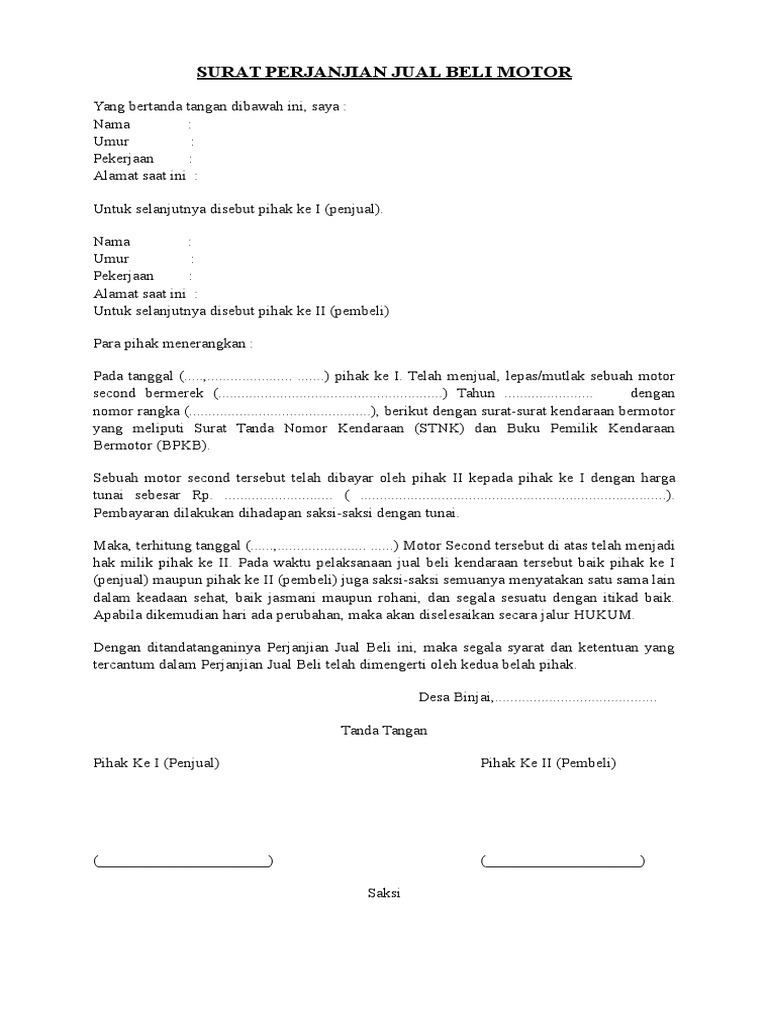 Surat perjanjian jual beli motor bekas. Surat jual beli mobil bekas. Surat perjanjian jual beli motor. Pasal 8 kendaraan bermotor dan segala surat suratnya diserahkan kepada pembeli setelah penandatanganan surat perjanjian jual beli ini.