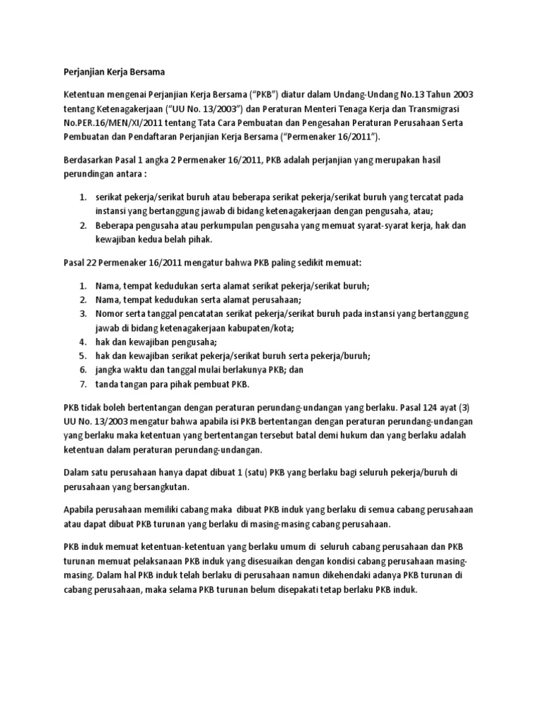 Perjanjian kerja bersama pkb adalah suatu kesepakatan secara tertulis dengan menggunakan bahasa indonesia yang dibuat secara bersama sama antara pengusaha atau beberapa pengusaha dengan organisasi serikat pekerjagabungan organisasi serikat pekerja yang sudah terdaftar pada instansi yang bertanggung jawab dibidang ketenagakerjaan.