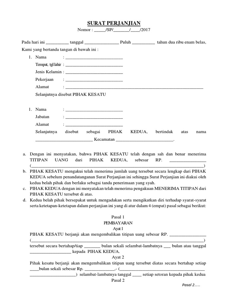 Contoh surat perjanjian hutang pada kesempatan kali ini saya akan berbagi mengenai contoh surat perjanjian hutang dengan jaminan. Pasal 4 biaya penagihan semua biaya penagihan titipan uang tersebut di atas termasuk biaya juru sita dan biaya biaya kuasa pihak kedua untuk mengambil titipan uang tersebut menjadi tanggungan dan wajib dibayarkan oleh pihak kesatu pasal 5 biaya biaya lainnya biaya pembuatan surat perjanjian ini dan segala biaya yang berhubungan dengan utang pinjaman tersebut di atas menjadi tanggungan. Pihak pertama berjanji akan melunasi uang pinjaman kepada pihak kedua dengan tenggang waktu selama 12 dua belas bulan terhitung dari sejak ditandatanganinya surat perjanjian ini.