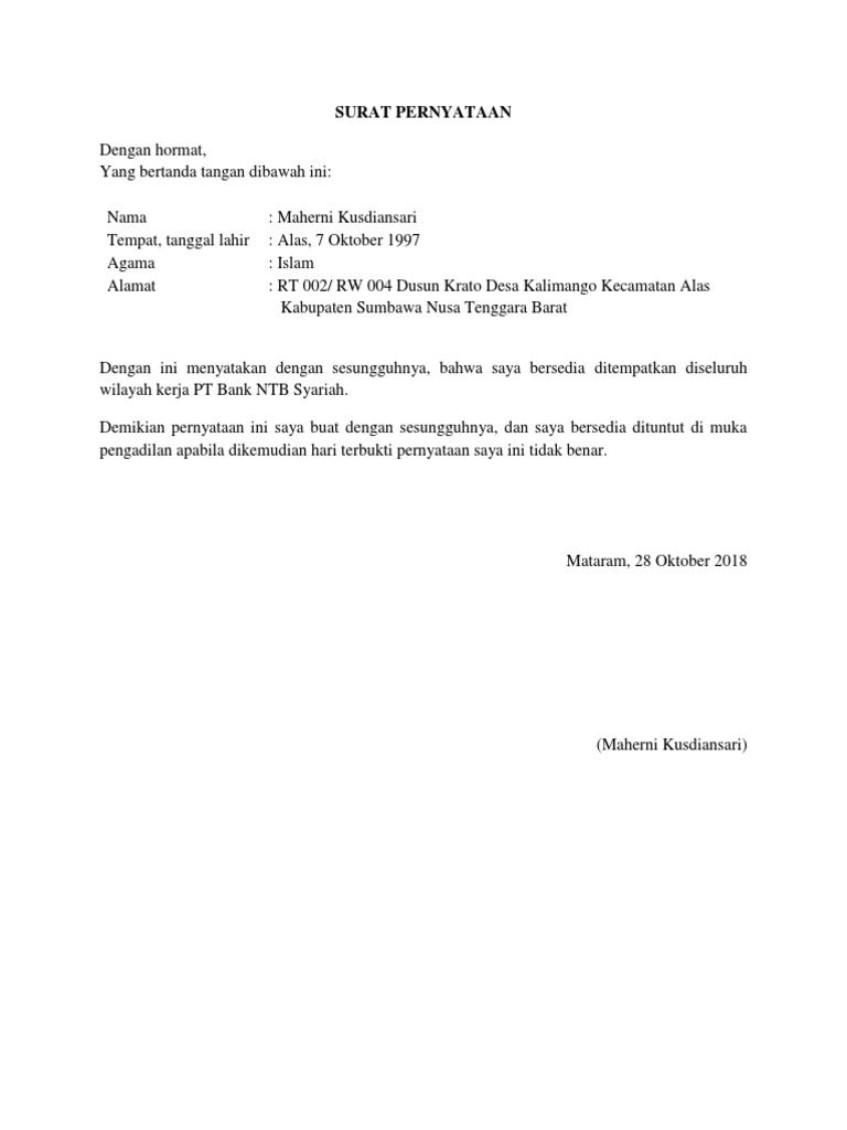 Contoh Surat Pernyataan Bersedia Ditempatkan Dimana Saja Ramadhan Ll