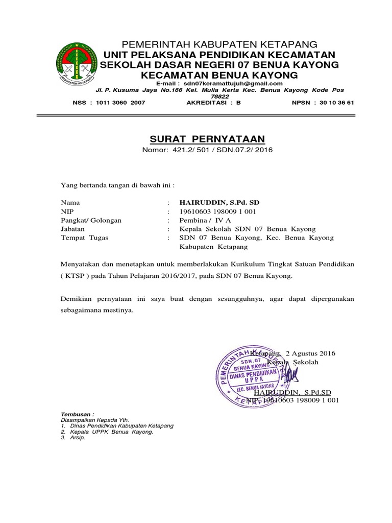 Surat Pernyataan Pemberlakuan Ktsp 2015