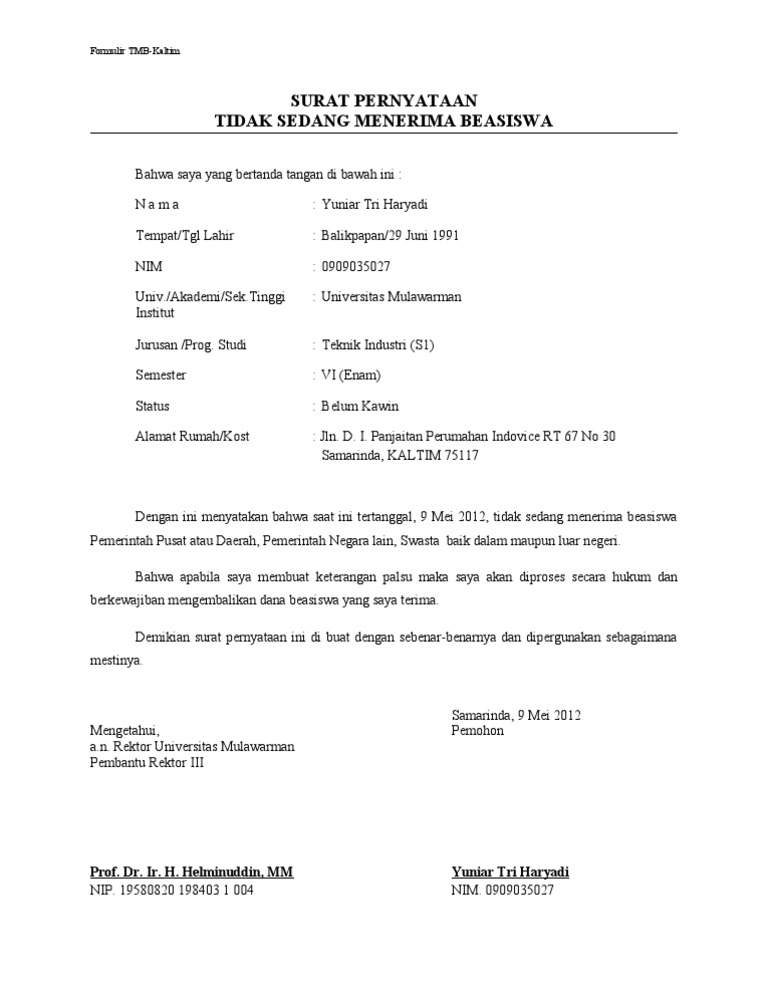 Surat pernyataan sedang tidak menerima beasiswa. 1 saya sedang tidak menerima bantuan beasiswa biaya pendidikan dari sumber dana apbd pemerintah provinsi kepulauan riau atau pemerintah kabupaten kota diwilayah provinsi kepulauan riau. Surat pernyataan tidak sedang menerima bantuanbeasiswa pihak lain kepada yth. Demikian dua contoh surat pernyataan tidak sedang menerima beasiswa dari pihak lain yang dapat kami sajikan pada kesempatan ini mudah mudahan dapat bermanfaat untuk anda para pembaca khususnya yang sedang mencari informasi terkait contoh surat pernyataan beasiswa tersebut.