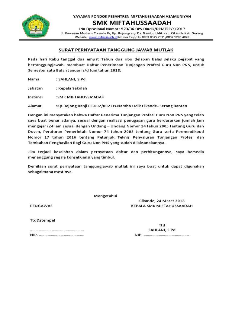 Contoh Surat Pernyataan Tanggung Jawab Mutlak Tunjangan Profesi Guru