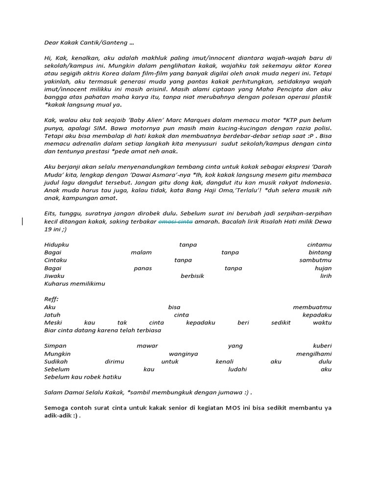 Buat surat cinta untuk kakak osis. Cara cara menulis surat untuk kakak osis cewek cowoksetiap mos pasti dong ada tugas tugas dari kakak osisyang suruh buat surat lah untuk kakak gugus osisnah sekarang kamu gak perlu pusing lagikarna disini ada contohnya. Cukup basa basinya ini dia contoh surat cinta dan surat benci untuk mos. Lintas harian surat cinta untuk kakak kelas kakak senior osis mos pada kesempatan kali ini admin akan memberikan suatu informasi buat kamu semua yang sedang mencari cari artikel seputar contoh surat cinta romantis untuk kakak senior atau kakak kelas diwaktu mos memang dalam kegiatan mos sendiri merupakan masa orientasi siswa yang wajib.