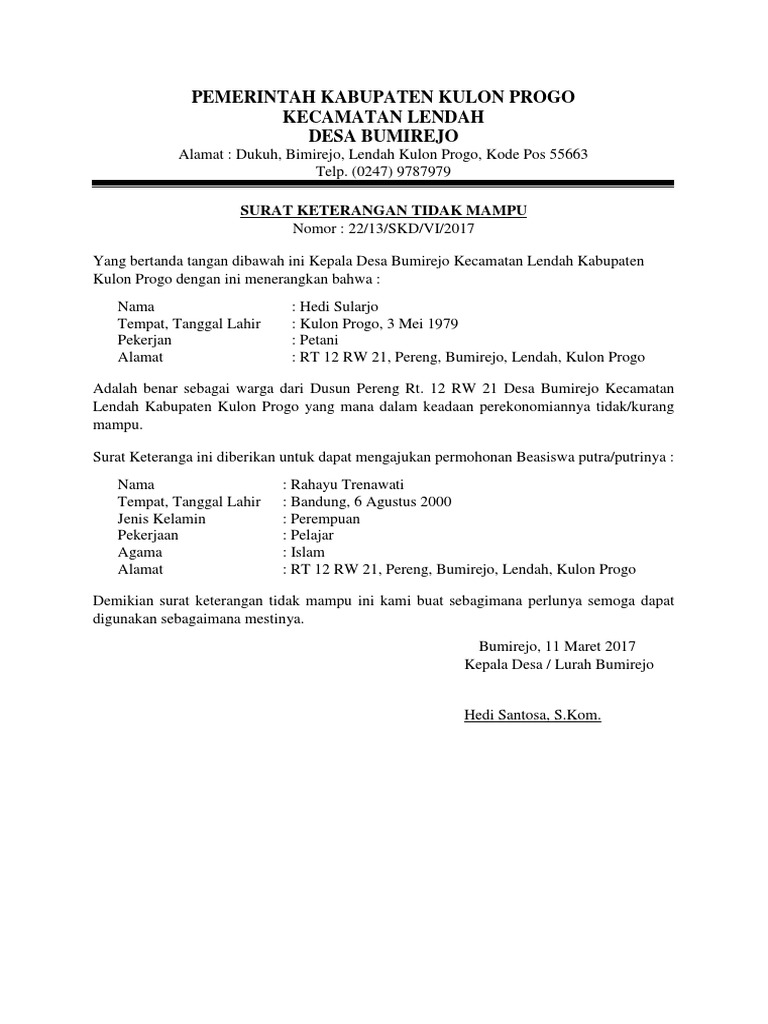Contoh Surat Keterangan Tidak Mampu Wisanggeni