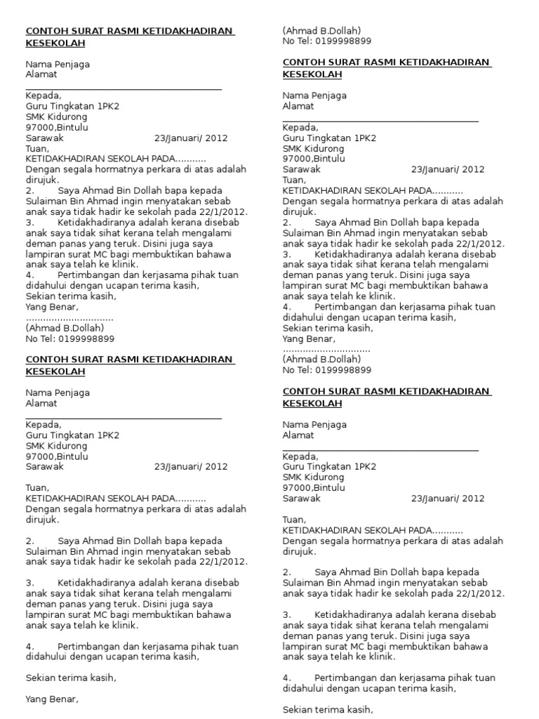 Contoh surat kiriman rasmi tidak hadir ke sekolah kerana sakit. Surat rasmi tidak hadir ke sekolah ini sangat penting untuk memastikan rekod berhenti sekolah pelajar baik dan tidak mempunyai rekod kesalahan ponteng sekolah. Surat rasmi rayuan mengurangkan kompaun. Categories pekerjaan tags cara buat surat tidak hadir ke sekolah contoh surat tidak hadir ke sekolah contoh surat tidak hadir ke sekolah kerana ada kematian contoh surat tidak hadir ke sekolah kerana balik kampung contoh surat tidak hadir ke sekolah kerana bercuti ke luar negara contoh surat tidak hadir ke sekolah kerana demam contoh surat tidak hadir ke sekolah kerana melawat orang sakit contoh surat tidak hadir ke sekolah kerana sakit contoh surat tidak hadir ke sekolah kerana.
