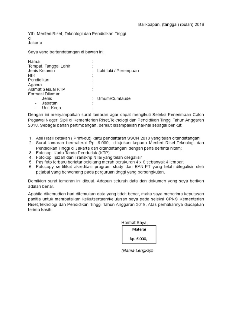 Contoh Surat Lamaran Cpns Kementerian Riset Teknologi Dan Pendidikan