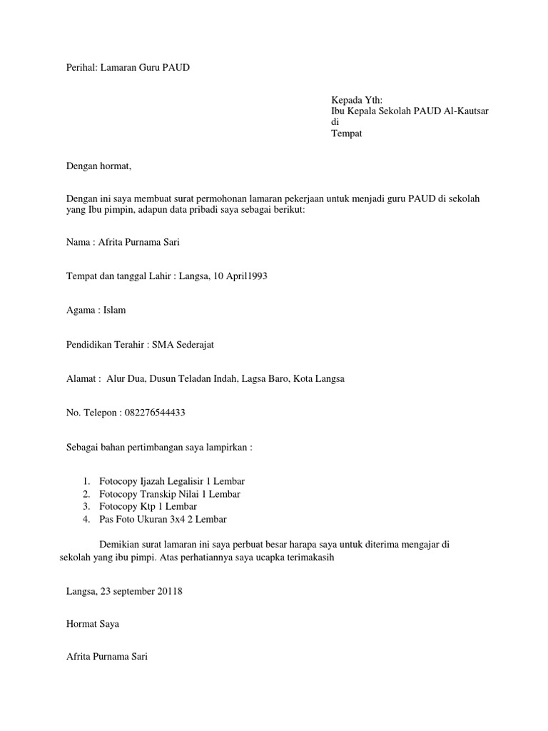 Download 5 Contoh Surat Lamaran Kerja Guru Paud Doc Pdf Portal