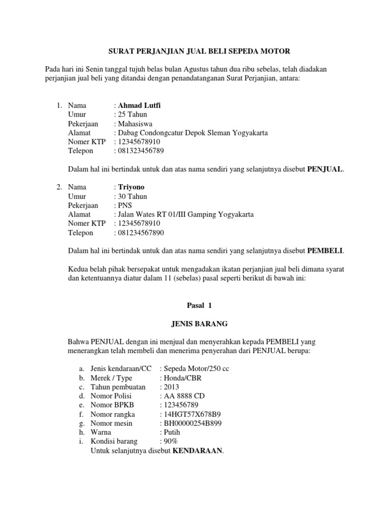 Pihak pertama diwajibkan dan dengan ini berjanji serta mengikatkan diri terhadap pihak kedua untuk menyerahkan sepeda motor tersebut dalam keadaan kondisi yang baik berikutkunci dan surat surat pemilikan kepada pihak kedua selambat lambatnya tanggal dua puluhlima januari dua ribu dua belas 25 01 12. Kita sudah sering sekali memberikan contoh contoh surat jual beli ini entah itu surat jual beli mobil maupun surat jual beli tanah. Perjanjian adalah perikatan di mana hak dan kewajiban yang timbul dikehendaki oleh para pihak subyek hukum.