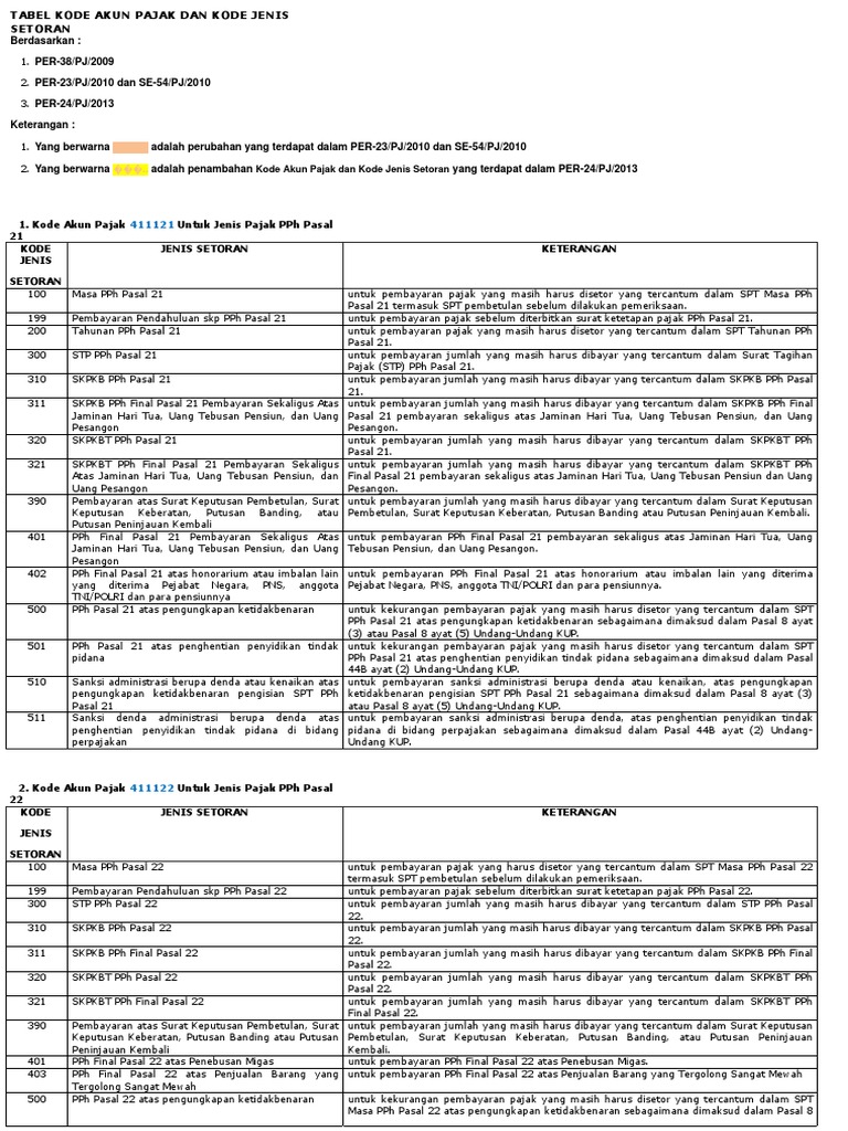 Berikut kode akun pajak pph pasal 21 pph pasal 25 dan pph pasal 29 untuk wajib pajak orang pribadi dan badan usaha untuk jenis setoran masa atau tahunan diperlukan saat mengisi data kode jenis setoran pajak ketika anda ingin melakukan pembayaran pajak. Kode pembayaran pajak dalam ssp maupun e billing pajak terdiri atas dua kode yaitu kode akun pajak kap dan kode jenis setoran kjs.