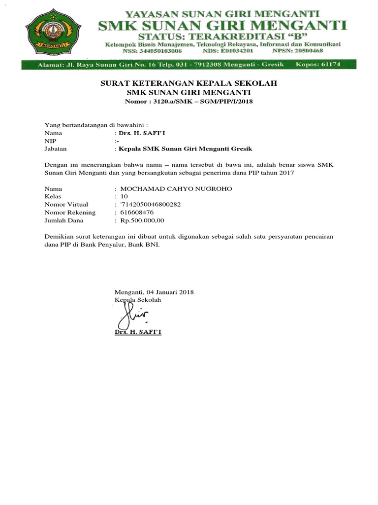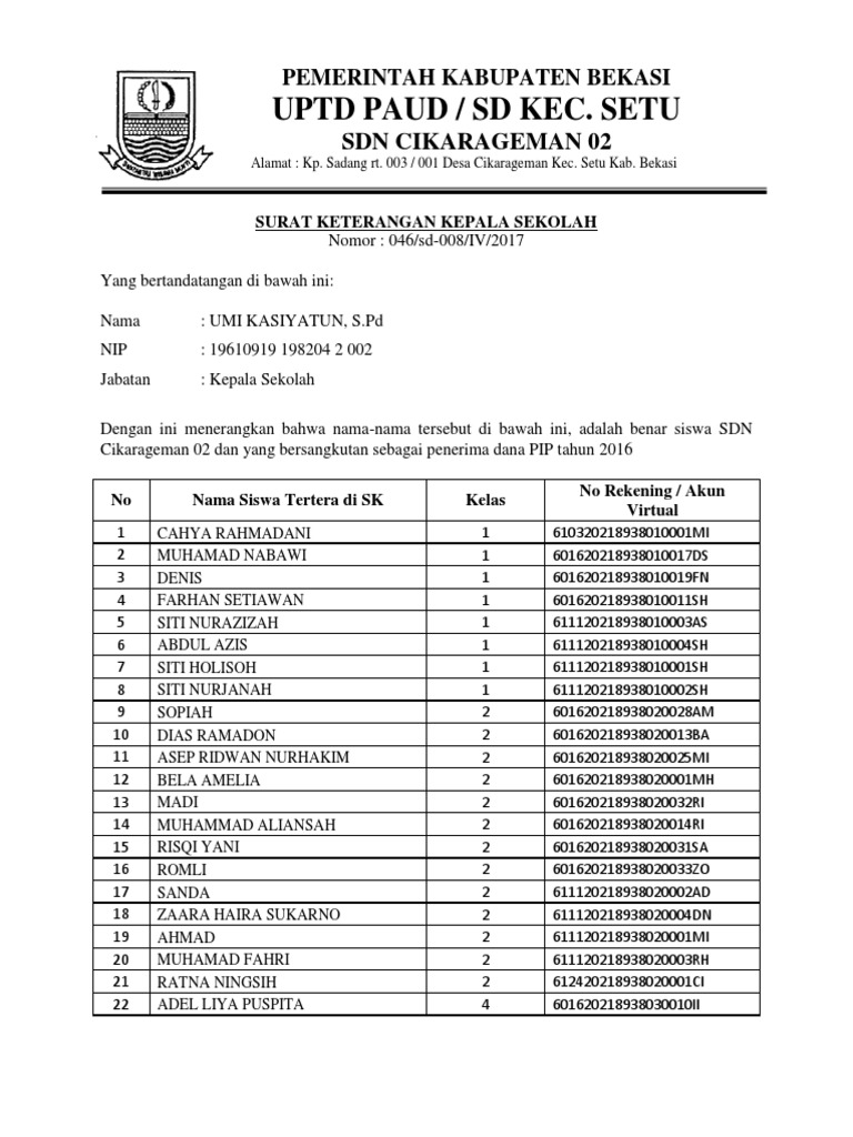 Salah satu identitas siswa penerima seperti. Surat keterangan kepala sekolah tanda tangan dan stempel basah asli. Apabila buku tabungan atau kip atm belum pernah diberikan oleh bank penyalur maka sanggup memakai surat keterangan kepala sekolah sebagai akseptor dana pip 2018.