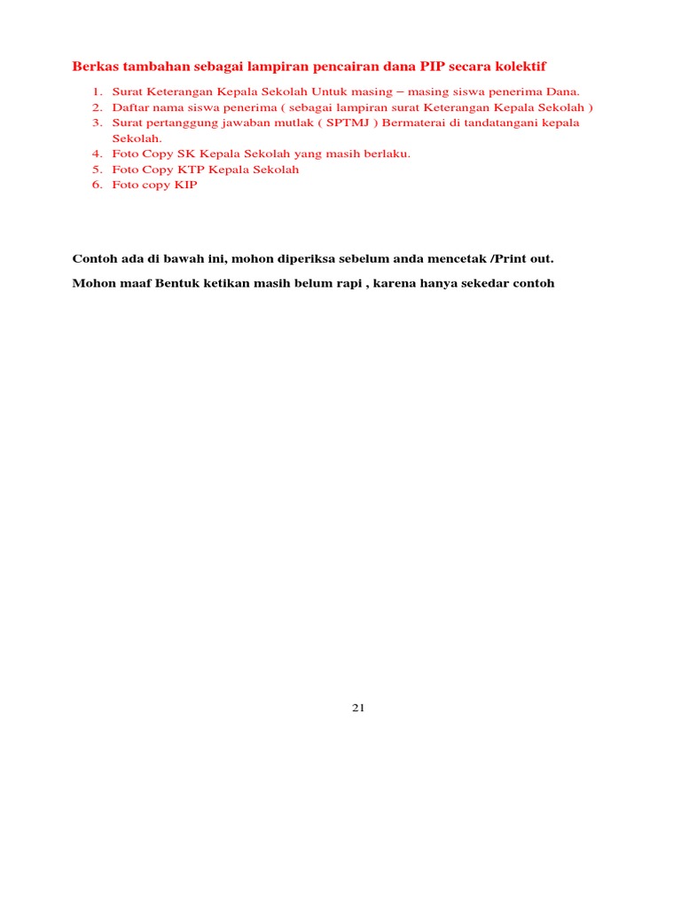 Sementara pihak dinas kabupaten meminta laporan pencairan berupa daftar koektif penyerahan dana dari kepala sekolah ke siswa oranng tua siswa. Surat tersebut berisi nama nama siswa penerima bsmpip yang benar benar berasal dari sekolah tersebut. Bagi yang menggunakan virtual account dan kebetulan berada di daerah yang jauh dari lembaga penyalur misalnya bank bri maka pencairanpengambilan dana bsmpip dapat diambil secara kolektif oleh kepala sekolahbendahara sekolah dengan syarat telah membuat surat kuasa.