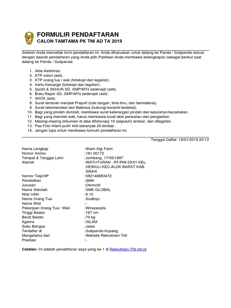 Jadwal Pendaftaran Penerimaan Tamtama Tni Ad Ta
