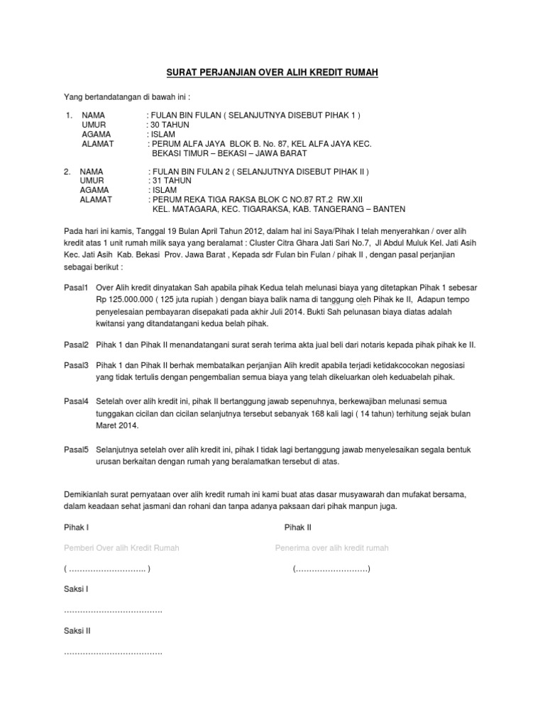 Dibawah ini adalah informasi Surat Perjanjian Jual Beli Rumah Over Kredit.