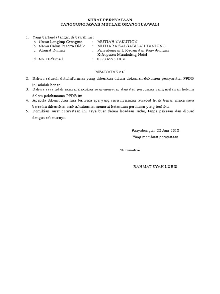Contoh Surat Pernyataan Tanggung Jawab Mutlak Untuk Ppdb 2019
