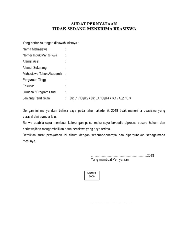 Contoh Surat Pernyataan Tidak Menerima Beasiswa Dari Pihak Lain