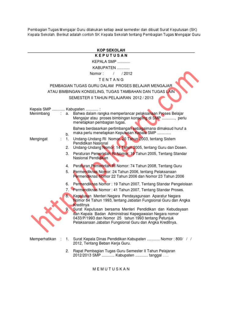 Contoh Sk Pembagian Tugas Guru Sd Smp Sma 20192020 Doc Radar