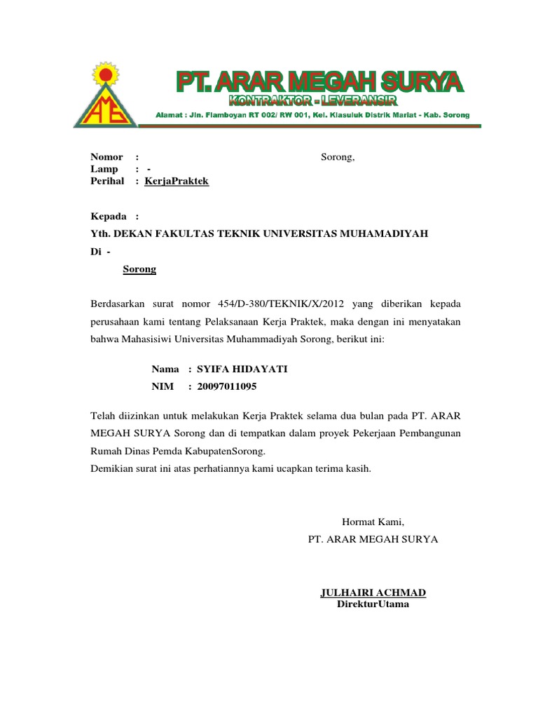 Contoh Surat Balasan Dari Perusahaan Untuk Pkl