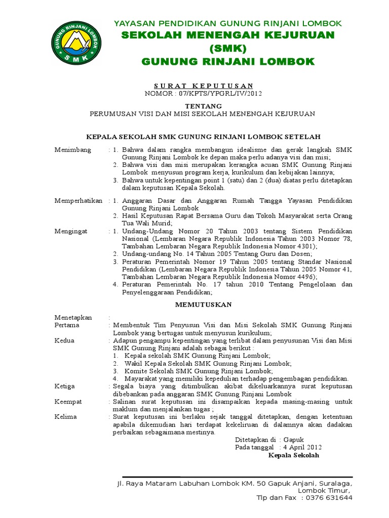 Apakah anda sedang mencari informasi Contoh Surat Keputusan Penetapan Visi Dan Misi Sekolah.