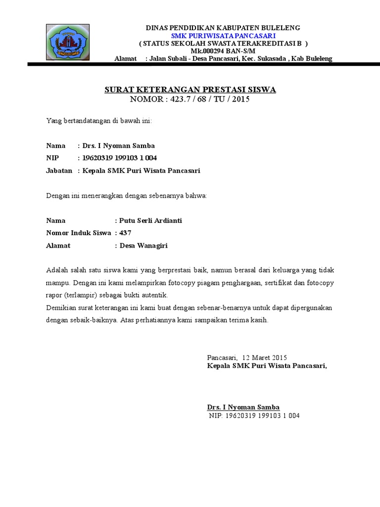 Contoh Format Surat Keterangan Siswa Berprestasi Dinamikapendidik