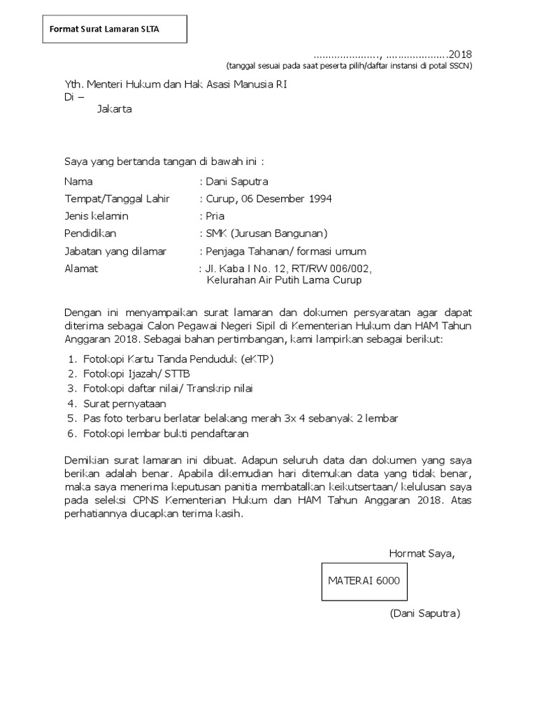 Contoh Surat Lamaran Cpns Kemenkumham 2018 Slta Sederajat Youtube