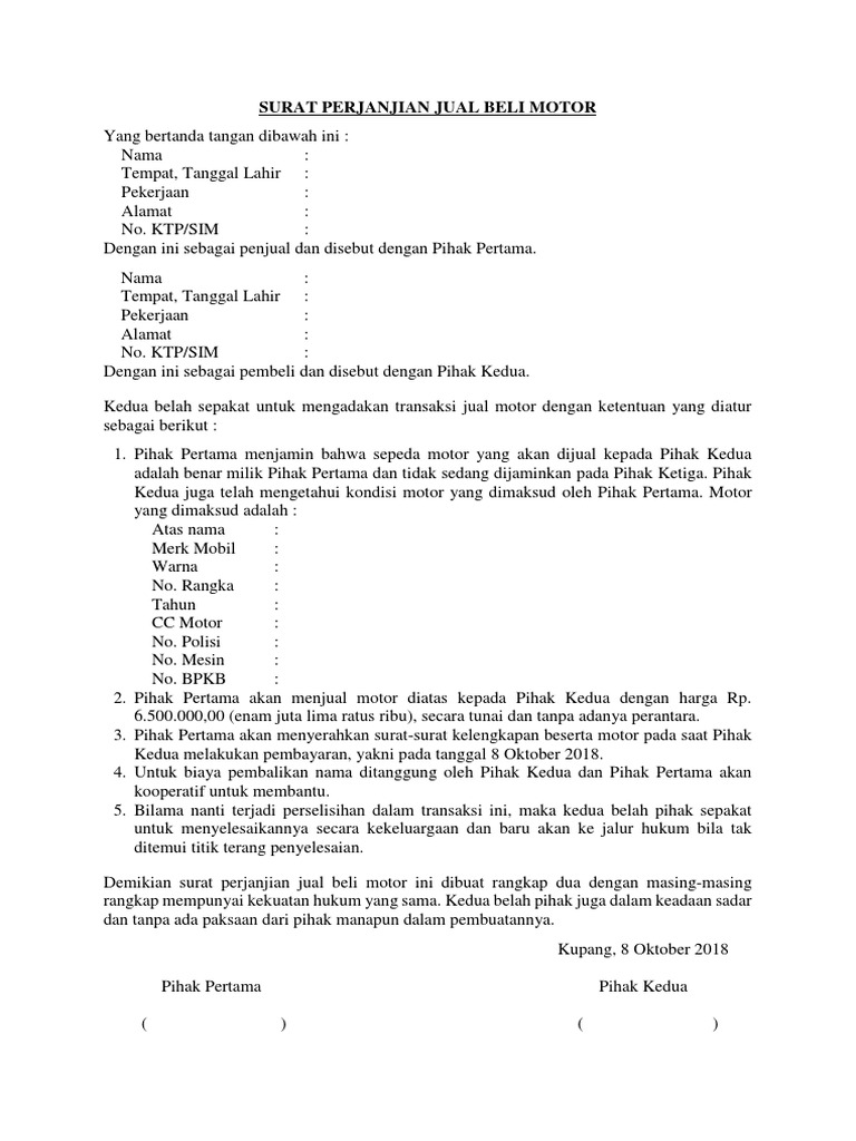 Contoh Surat Perjanjian Jual Beli Sepeda Motor Docx Document