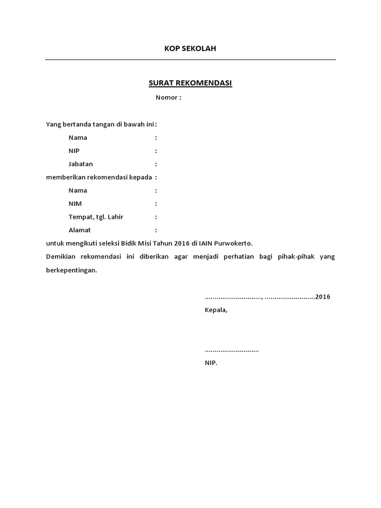 Contoh Surat Rekomendasi Kepala Sekolah Untuk Bidikmisi
