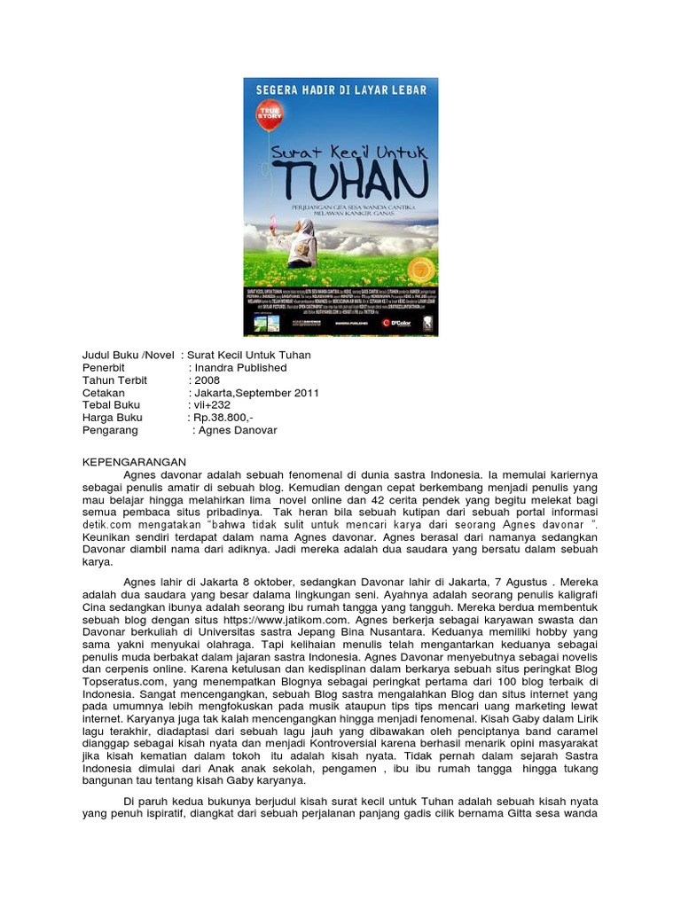 Jakartaseptember 2011 edisi. Ribuan air mata berjatuhan ketika kisah ini dibaca atas permintaan pembacanya agnes davonar pun membuat kisah ini menjadi novel keduanya dan pastinya kisah ini lebih sempurna dengan ribuan air mata yang siap berjatuhan disetiap bait perjalanan keke. Sinopsis novel surat kecil untuk tuhan ini hanya membahas unsur unsur yang penting dalam kisah ini.