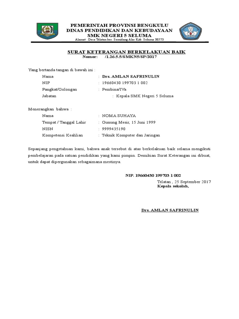 Surat berkelakuan baik dari kepala sekolah. Contoh file berikut ini adalah kumpulan dari berbagi sumber tentang contoh surat kelakuan baik dari kepala sekolah untuk guru yang bisa bapakibu gunakan dan diunduh secara gratis dengan menekan tombol download biru dibawah ini. Home surat contoh surat keterangan kelakuan baik dari sekolah. Skkb menjadi suatu kebutuhan bagi seseorang saat mengajukan permohonan pekerjaan atau mendaftar ke suatu instansi.