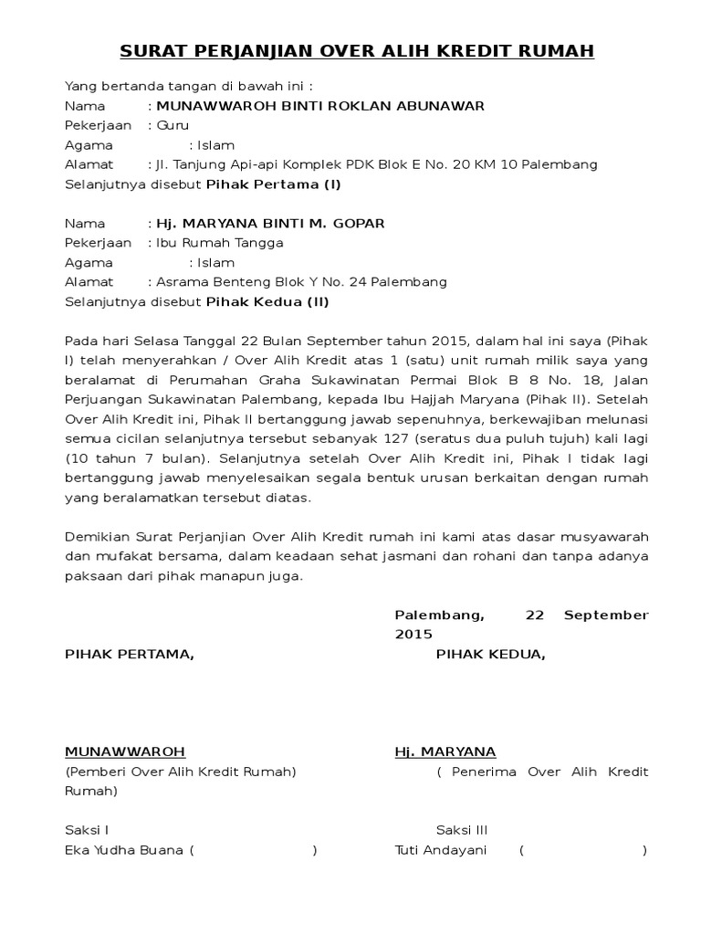 Contoh Surat Perjanjian Over Kredit Rumah Dibawah Tangan